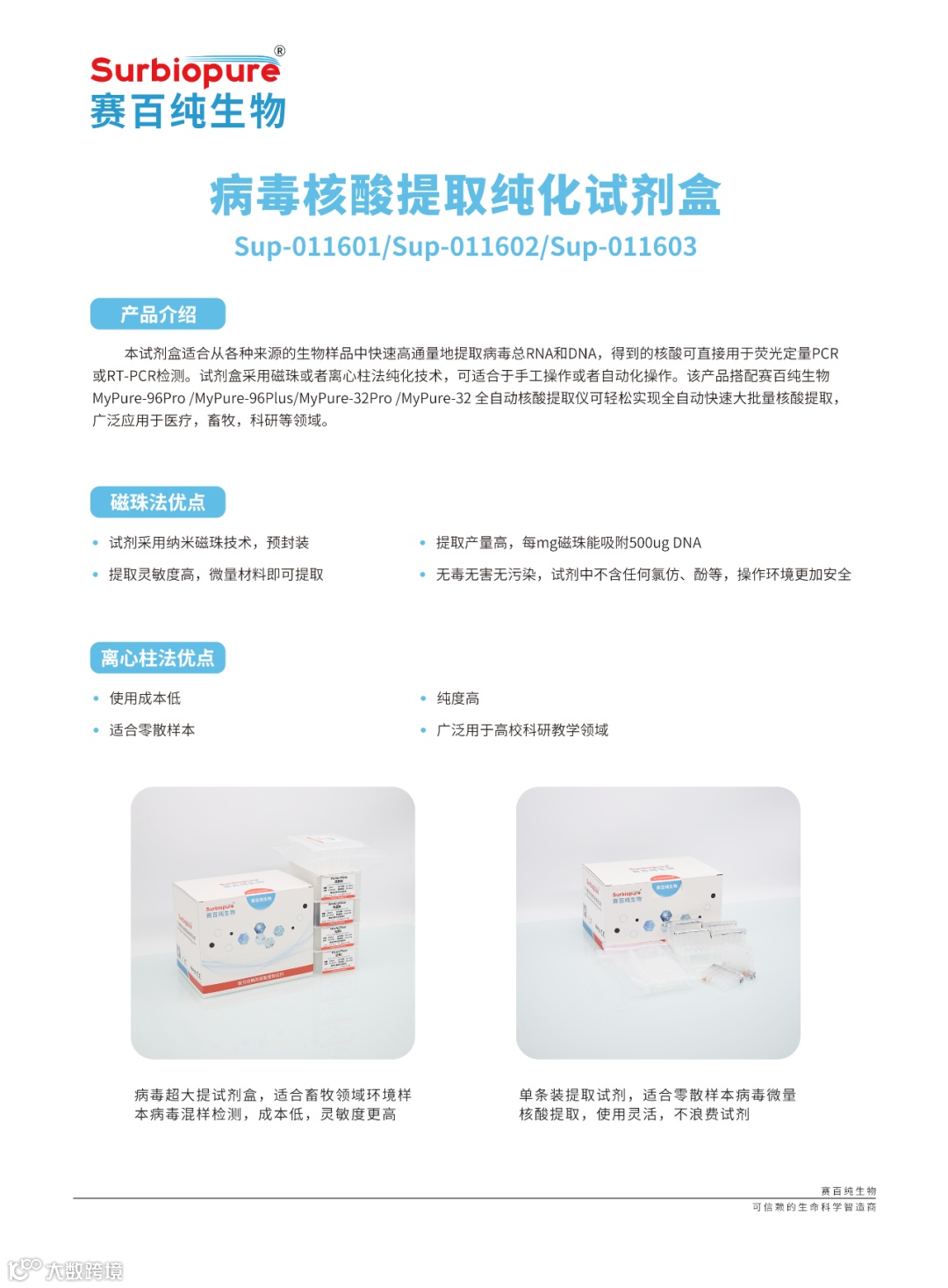 广州赛百纯生物科技有限公司(以下简称赛百纯生物)作为诊断及检测行业的企业,本次展会携猪场病毒核酸混检大筛查解决方案[核酸提取试剂盒(超大提)+MyPure-96Pro 全自动核酸提取仪(24通量大体积)]、核酸提取试剂盒(单条装)、MyPure-32Pro 全自动核酸提取仪、Surbiopure-FY96 全自动样品处理系统、PCR系列耗材、移液器、移液吸头、Surbiolyser-4迷你样本均质仪、超悬浮磁珠亮相本次李曼中国养猪大会。