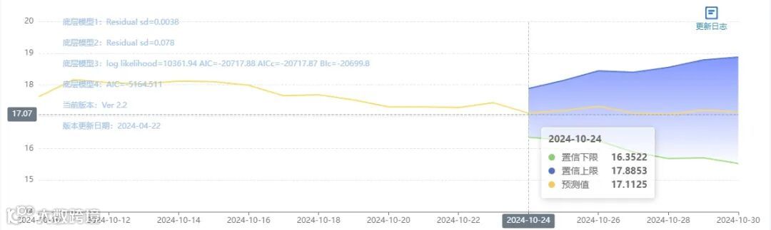 玄田算法是由项目课题组团队原创的非经典逻辑数值聚合理论和不确定性预测方法,构建了基于一致模算子的生猪价格预测模型。该模型采用的聚合函数及一致模相关理论与方法已获得多项国家自然科学基金和省级自然科学资金资助,并获得多项省级自然科学奖奖项。10月24日预测猪价为17.1125,置信区间在16.3522--17.8853之间。10月25日预测猪价为17.1932;10月26日预测猪价为17.3238。
