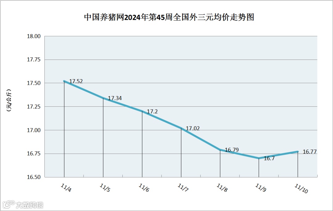 据中国养猪网猪价系统数据监测,2024年第45周(2024年11月4日至2024年11月10日)全国外三元生猪价格周初至周中持续震荡走跌,周中至周末小幅缓慢回升,整体区间在16.70-17.52元/公斤之间!周初猪价为17.52元/公斤,周末猪价为16.77元/公斤,全周猪价累计下跌了0.75元/公斤。