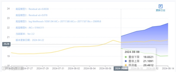 玄田算法是由项目课题组团队原创的非经典逻辑数值聚合理论和不确定性预测方法,构建了基于一致模算子的生猪价格预测模型。该模型采用的聚合函数及一致模相关理论与方法已获得多项国家自然科学基金和省级自然科学资金资助,并获得多项省级自然科学奖奖项。08月08日预测猪价为20.4812,置信区间在19.8321--21.1091之间。08月09日预测猪价为20.5026;08月10日预测猪价为20.5746。