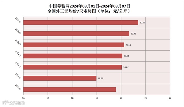 2024年08月07日(星期三),据中国养猪网猪价系统监测,全国外三元均价为20.69元/公斤,猪价较昨日(20.32元/公斤)上涨了0.37元/公斤,较上月(18.49元/公斤)上涨了2.20元/公斤。