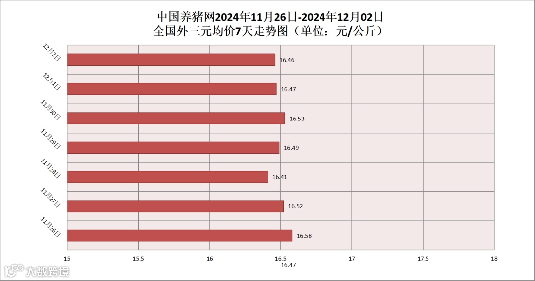 其他生猪品种方面,生猪内三元均价为16.48元/公斤,价格较昨日(16.51元/公斤)下跌了0.03元/公斤;生猪土杂猪均价为16.32元/公斤,价格较昨日(16.39元/公斤)下跌了0.07元/公斤。