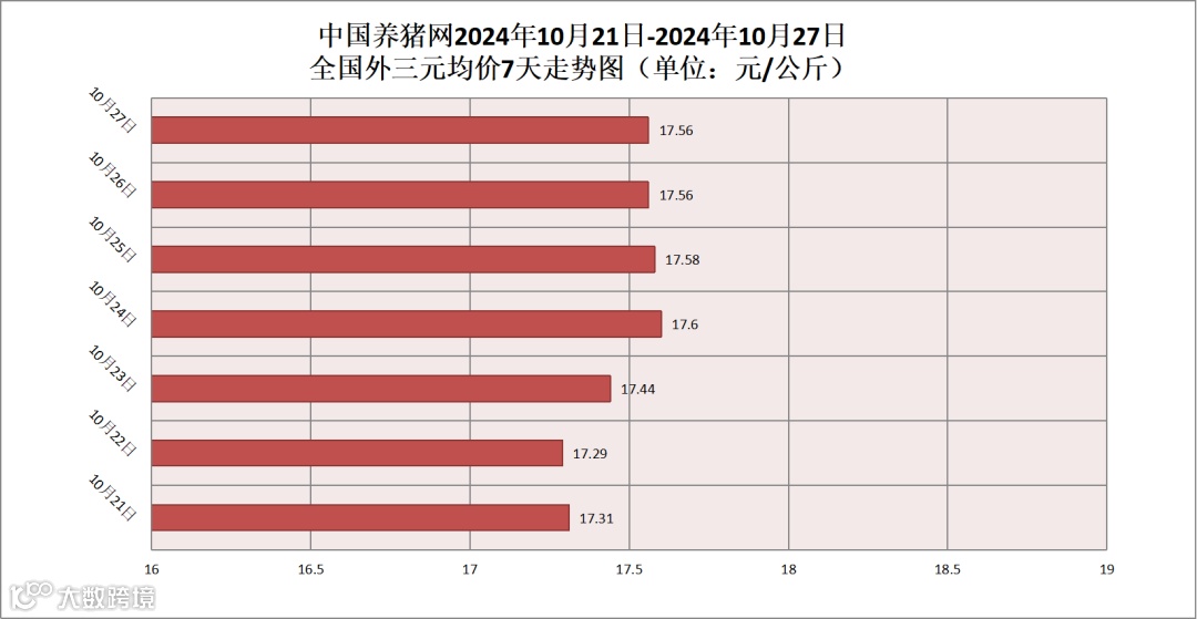 其他生猪品种方面,生猪内三元均价为17.41元/公斤,价格较昨日(17.43元/公斤)下跌了0.02元/公斤;生猪土杂猪均价为17.09元/公斤,价格较昨日(17.12元元/公斤)下跌了0.03元/公斤。