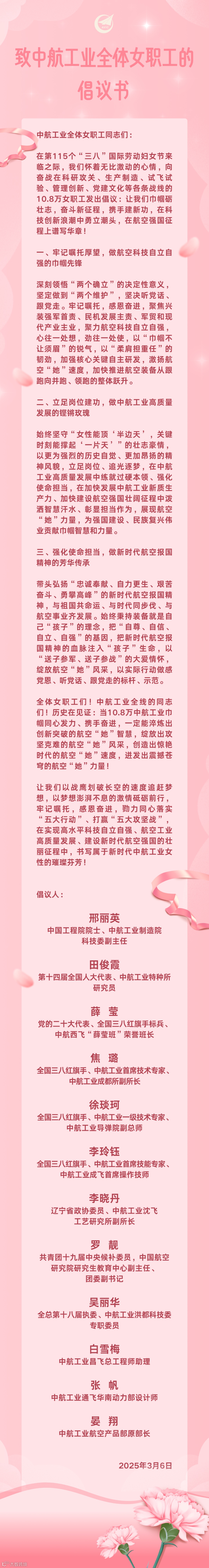 巾帼聚力 共筑航空强国梦——致中航工业全体女职工倡议书