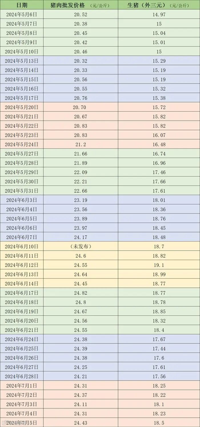 本周国内生猪价格震荡上行,周均价环比上涨。据中国养猪网的数据,7月5日,生猪(外三元)价格为18.5元/公斤,与上周五(6月28日)的17.56元/公斤相比,上涨5.4%。从一周均价来看,本周生猪均价为18.26元/公斤,与上周17.58元/公斤的均价相比,上涨3.9%。