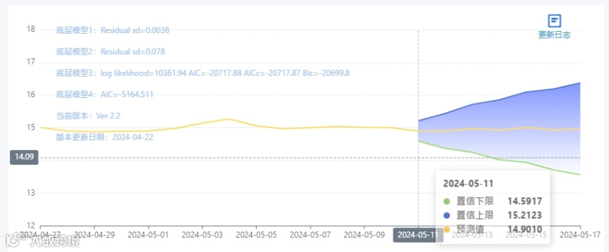 玄田算法是由项目课题组团队原创的非经典逻辑数值聚合理论和不确定性预测方法,构建了基于一致模算子的生猪价格预测模型。该模型采用的聚合函数及一致模相关理论与方法已获得多项国家自然科学基金和省级自然科学资金资助,并获得多项省级自然科学奖奖项。05月11日预测猪价为14.9010,置信区间在14.5917--15.2123之间。05月12日预测猪价为14.8947;05月13日预测猪价为14.9779。