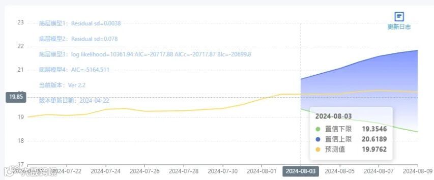 玄田算法是由项目课题组团队原创的非经典逻辑数值聚合理论和不确定性预测方法,构建了基于一致模算子的生猪价格预测模型。该模型采用的聚合函数及一致模相关理论与方法已获得多项国家自然科学基金和省级自然科学资金资助,并获得多项省级自然科学奖奖项。08月03日预测猪价为19.9762,置信区间在19.3546-20.6189之间。08月04日预测猪价为19.9784;08月05日预测猪价为19.9941。