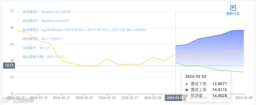 玄田算法是由项目课题组团队原创的非经典逻辑数值聚合理论和不确定性预测方法,构建了基于一致模算子的生猪价格预测模型。该模型采用的聚合函数及一致模相关理论与方法已获得多项国家自然科学基金和省级自然科学资金资助,并获得多项省级自然科学奖奖项。03月02日预测猪价为14.4028,置信区间在13.9077--14.9115之间。03月03日预测猪价为14.3209;03月04日预测猪价为14.5089。
