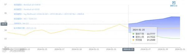 玄田算法是由项目课题组团队原创的非经典逻辑数值聚合理论和不确定性预测方法,构建了基于一致模算子的生猪价格预测模型。该模型采用的聚合函数及一致模相关理论与方法已获得多项国家自然科学基金和省级自然科学资金资助,并获得多项省级自然科学奖奖项。01月25日预测猪价为14.2569,置信区间在13.7777--14.7511之间。01月26日预测猪价为14.2006;01月27日预测猪价为14.3332。
