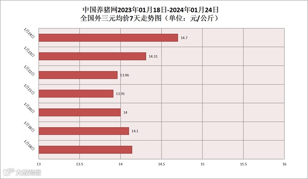 根据“2024年01月24日-中国养猪网生猪(外三元)均价涨跌表”发现,国内外三元生猪价格出现震荡走高走势,猪价最低为新疆维吾尔自治区13.23元/公斤,最高为海南省16.62元/公斤。春节将至,南北地区陆陆续续开始备货,生猪消费需求有所改善,叠加饲料原料价格大幅下降,生猪养殖业压力较为减轻,以及肥猪刚需转强,养殖户看涨情绪高燃,在市场供需调整下,猪价持续强势上涨,生猪均价逐步上升!随着猪价涨幅不断扩大,养殖端出栏心态转强,加上白条价格大幅跟涨后,贸易商接货难度增加,市场情绪或转差!预计,猪价或将冲高回落,但由于春节前集中备货的周期在即,猪价下跌难以持续,猪价短暂涨跌调整后,或再次走高!