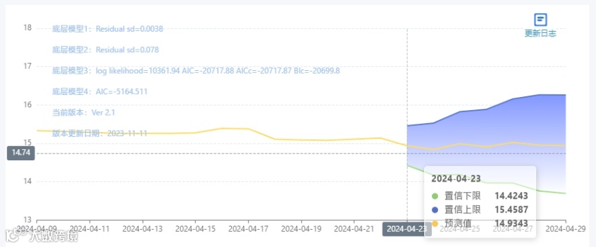 玄田算法是由项目课题组团队原创的非经典逻辑数值聚合理论和不确定性预测方法,构建了基于一致模算子的生猪价格预测模型。该模型采用的聚合函数及一致模相关理论与方法已获得多项国家自然科学基金和省级自然科学资金资助,并获得多项省级自然科学奖奖项。04月23日预测猪价为14.9343,置信区间在14.4243--15.4587之间。04月24日预测猪价为14.8401;04月25日预测猪价为14.9909。