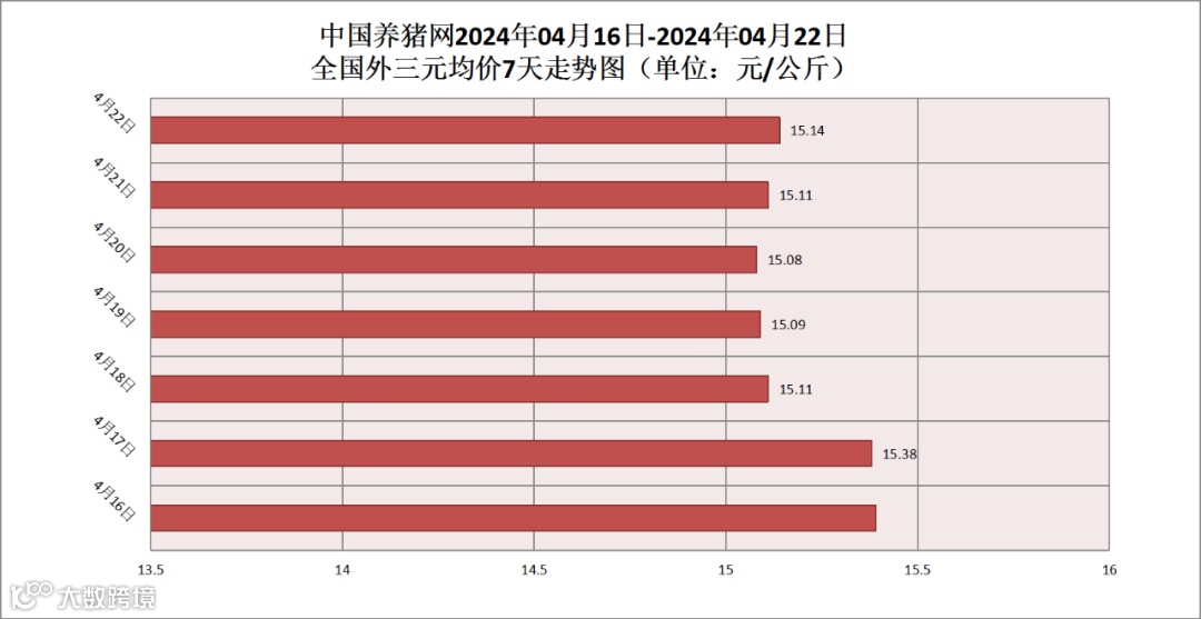 其他生猪品种方面,生猪内三元均价为14.96元/公斤,价格较昨日(14.87元/公斤)上涨了0.09元/公斤;生猪土杂猪均价为14.51元/公斤,价格较昨日(14.46元/公斤)上涨了0.05元/公斤。