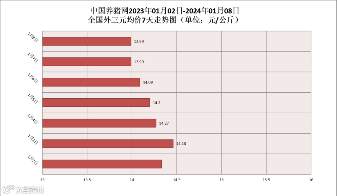其他生猪品种方面,生猪内三元均价为14.08元/公斤,价格较昨日(14.06元/公斤)上涨了0.02元/公斤;生猪土杂猪均价为13.70元/公斤,价格较昨日(13.65元/公斤)上涨了0.05元/公斤。