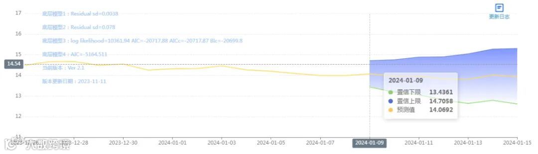 玄田算法是由项目课题组团队原创的非经典逻辑数值聚合理论和不确定性预测方法,构建了基于一致模算子的生猪价格预测模型。该模型采用的聚合函数及一致模相关理论与方法已获得多项国家自然科学基金和省级自然科学资金资助,并获得多项省级自然科学奖奖项。01月09日预测猪价为14.0692,置信区间在13.4361--14.7058之间。01月10日预测猪价为13.9650;01月11日预测猪价为13.9614。