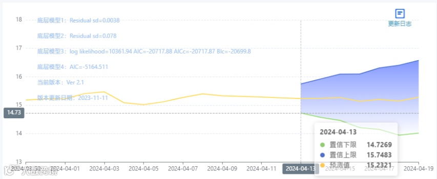 玄田算法是由项目课题组团队原创的非经典逻辑数值聚合理论和不确定性预测方法,构建了基于一致模算子的生猪价格预测模型。该模型采用的聚合函数及一致模相关理论与方法已获得多项国家自然科学基金和省级自然科学资金资助,并获得多项省级自然科学奖奖项。04月13日预测猪价为15.2321,置信区间在14.7269-15.7483之间。04月14日预测猪价为15.2405;04月15日预测猪价为15.2693。