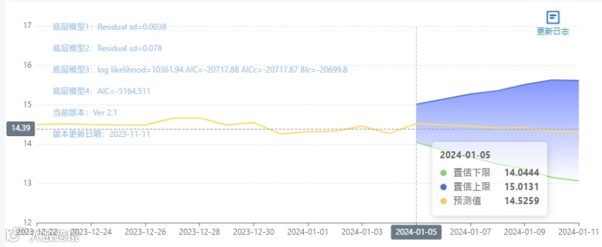 玄田算法是由项目课题组团队原创的非经典逻辑数值聚合理论和不确定性预测方法,构建了基于一致模算子的生猪价格预测模型。该模型采用的聚合函数及一致模相关理论与方法已获得多项国家自然科学基金和省级自然科学资金资助,并获得多项省级自然科学奖奖项。01月05日预测猪价为14.5259,置信区间在14.0444--15.0131之间。01月06日预测猪价为14.4918;01月07日预测猪价为14.4618。