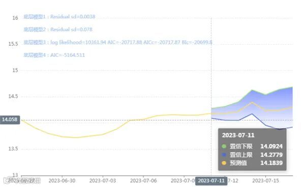 玄田算法是由项目课题组团队原创的非经典逻辑数值聚合理论和不确定性预测方法,构建了基于一致模算子的生猪价格预测模型。该模型采用的聚合函数及一致模相关理论与方法已获得多项国家自然科学基金和省级自然科学资金资助,并获得多项省级自然科学奖奖项。07月11日预测猪价为14.1839,置信区间在14.0924--14.2779之间。07月11日预测猪价为14.1802;07月12日预测猪价为14.2214。