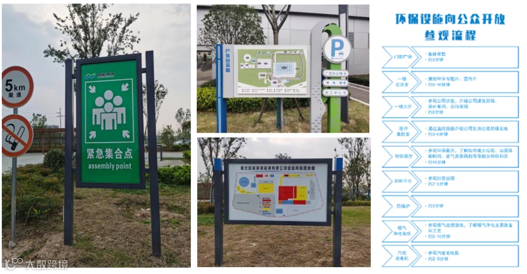 5、厂区设置了指引导识、环境标语、安全标语、沙盘、参观流程以及特殊情况下的紧急集合点等标识标牌,为参观人员提供安全的场所。