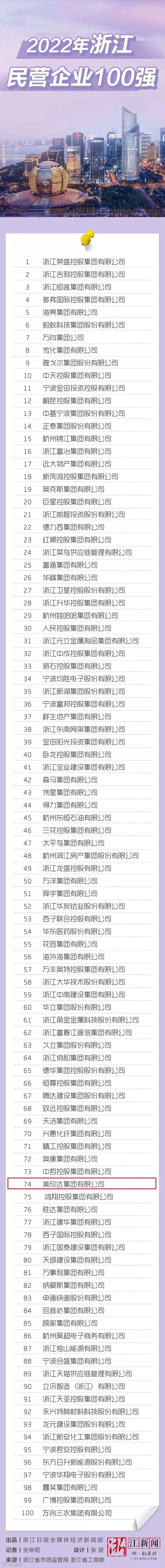 9月13日,省市场监管局、省工商业联合会联合对外公布“2022年浙江省民营企业100强”榜单,美欣达集团有限公司上榜,位列74位。