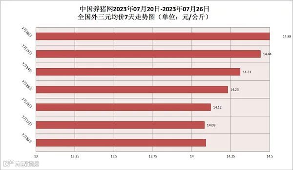 2023年07月26日(星期三),据中国养猪网猪价系统监测,全国外三元均价为14.88元/公斤,猪价较昨日(14.44元/公斤)上涨了0.44元/公斤,较上月(14.08元/公斤)上涨了0.8元/公斤。