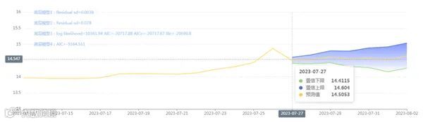 玄田算法是由项目课题组团队原创的非经典逻辑数值聚合理论和不确定性预测方法,构建了基于一致模算子的生猪价格预测模型。该模型采用的聚合函数及一致模相关理论与方法已获得多项国家自然科学基金和省级自然科学资金资助,并获得多项省级自然科学奖奖项。07月27日预测猪价为14.5053,置信区间在14.4115--14.604之间。07月28日预测猪价为14.5343;07月29日预测猪价为14.6110。