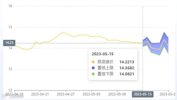 预测模型。该模型采用的聚合函数及一致模相关理论与方法已获得多项国家自然科学基金和省级自然科学资金资助,并获得多项省级自然科学奖奖项。根据玄田算法预测,5月15日预测猪价为14.2213,置信区间在14.0821--14.3682之间。5月16日预测猪价为14.3356;5月17日预测猪价为14.0205。