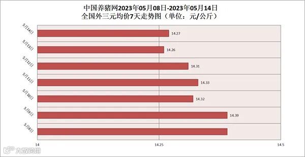 导读:2023年05月14日(星期日),据中国养猪网猪价系统监测,全国外三元均价为14.27元/公斤,猪价较昨日