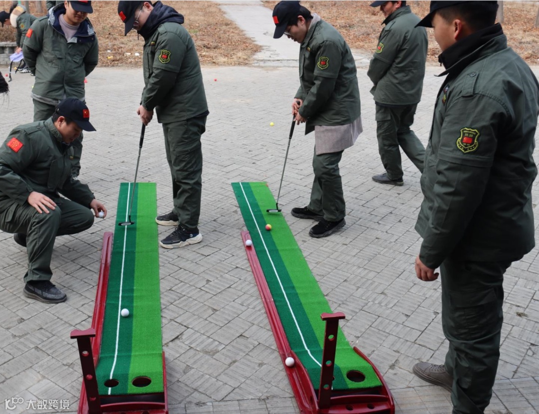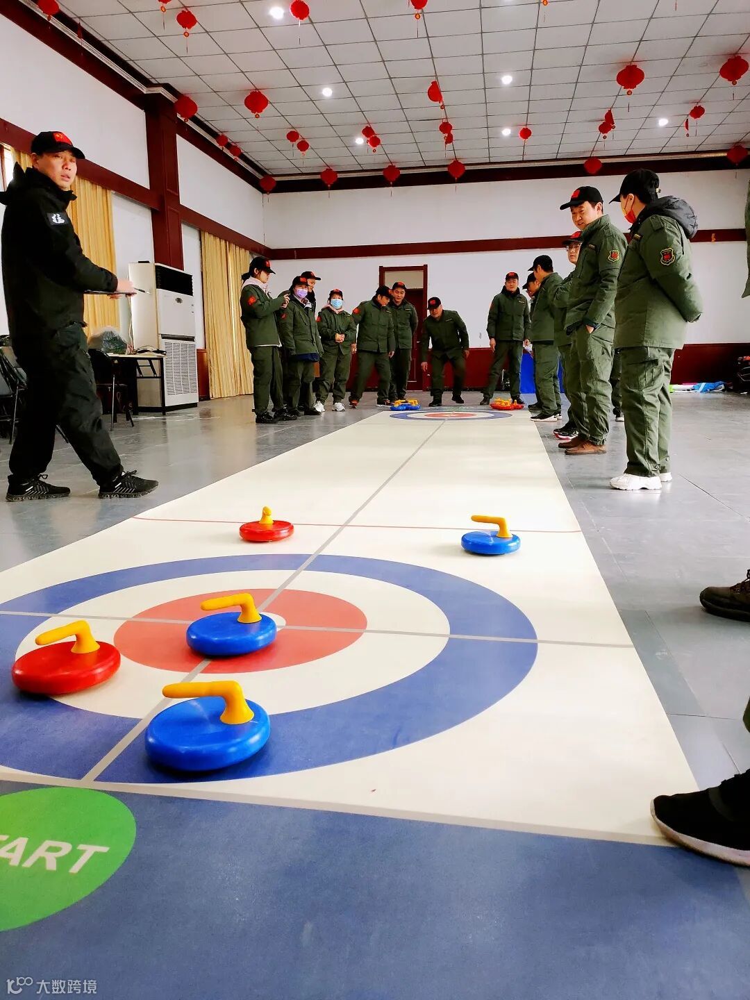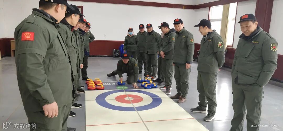 第二个游戏是旱地冰壶,每个小队在平滑地面上进行冰壶投掷,通过让本方旱地冰壶球停在预先设定好的位置或将对方旱地冰壶球击出,达到制胜的目的。看似简单的游戏,其实是一项通过团队协作比拼个人技术和战术的比赛,各个小队紧张的商议出场顺序及战术,最终“野狼队”以领先两分的成绩获得胜利!