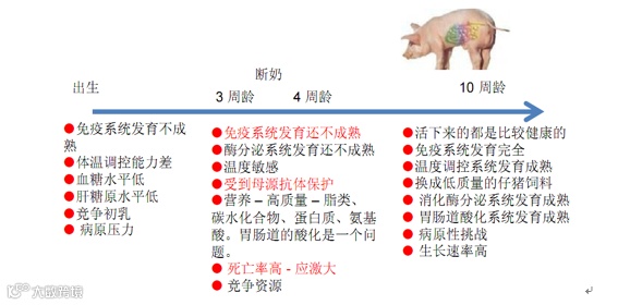 出生1天的仔猪,胃重仅4~8克,只能容纳乳汁40毫升左右。在整个哺乳期,仔猪胃肠道迅速增长,在其35~40日龄时胃蛋白酶开始有消化能力,消化机能逐渐完善。