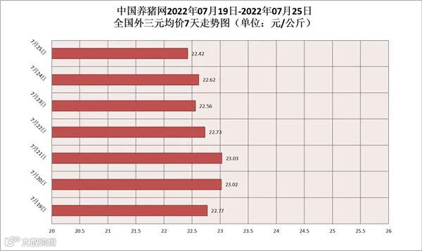 2022年07月25日(星期一),据中国养猪网猪价系统监测,全国外三元均价为22.42元/公斤,猪价较昨日(21.21元/公斤)下跌了0.20元/公斤,较上月(17.96元/公斤)上涨了4.46元/公斤。