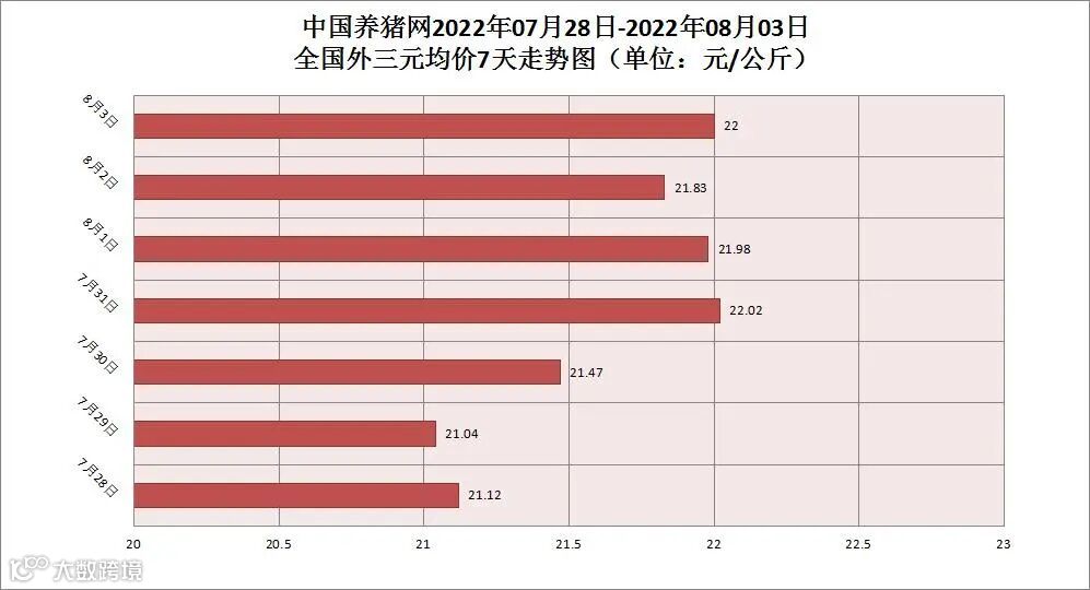 2022年08月03日(星期三),据中国养猪网猪价系统监测,全国外三元均价为22.00元/公斤,猪价较昨日(21.83元/公斤)上涨了0.17元/公斤,较上月(20.73元/公斤)上涨了1.27元/公斤。