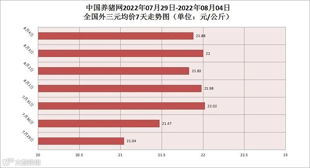 2022年08月04日(星期四),据中国养猪网猪价系统监测,全国外三元均价为21.88元/公斤,猪价较昨日(22.00元/公斤)下跌了0.12元/公斤,较上月(21.48元/公斤)上涨了0.40元/公斤。