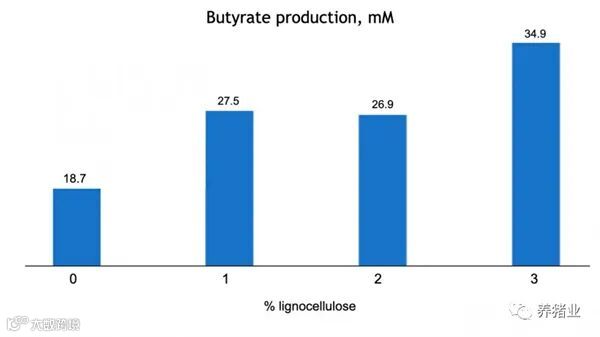 图一。木质纤维素内含物对63日龄断奶仔猪丁酸盐产量(mM)的剂量依赖性影响P=0.001 SEM= 1.810。