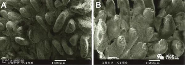 图二。A:不添加纤维(绒毛高度:538米)B:1%木质纤维素(绒毛高度:616米)的断奶仔猪十二指肠粘膜电镜图像。