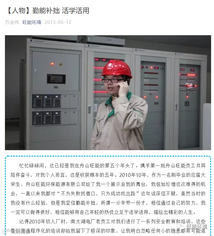 上海电力大学是旺能环境开展深度校企融合的合作单位之一。回顾近十年,旺能环境通过校企合作引进了大量优秀的人才。十年前,一名应届毕业生方金伟通过校企合作进入舟山旺能环保能源有限公司,通过他踏踏实实、任劳任怨的努力和坚持,从一名基层电仪检修员已晋升为舟山旺能的技术骨干——技术部经理兼热控专工。2015年6月12日,旺能环境曾对他进行了专访,他在《【人物】勤能补拙 活学活用 》中说到:“ 从一个普通的员工逐步迈上技术骨干岗位,我感触最深的就是舟山旺能这个团队的凝聚力与和谐氛围,大家经常性聚在一起讨论工作,为某一技改项目或检修运行方式提出各专业不同的方案,虽然在讨论中会出现分歧,但大家彼此尊重,互相探讨,直至最终方案的落实。其实我个人挺喜欢这种讨论方式,只有在不同意见想法的磨合中,你才能找到最适合最全面的方案,并加深对自身专业的认知并了解其他专业的知识。”