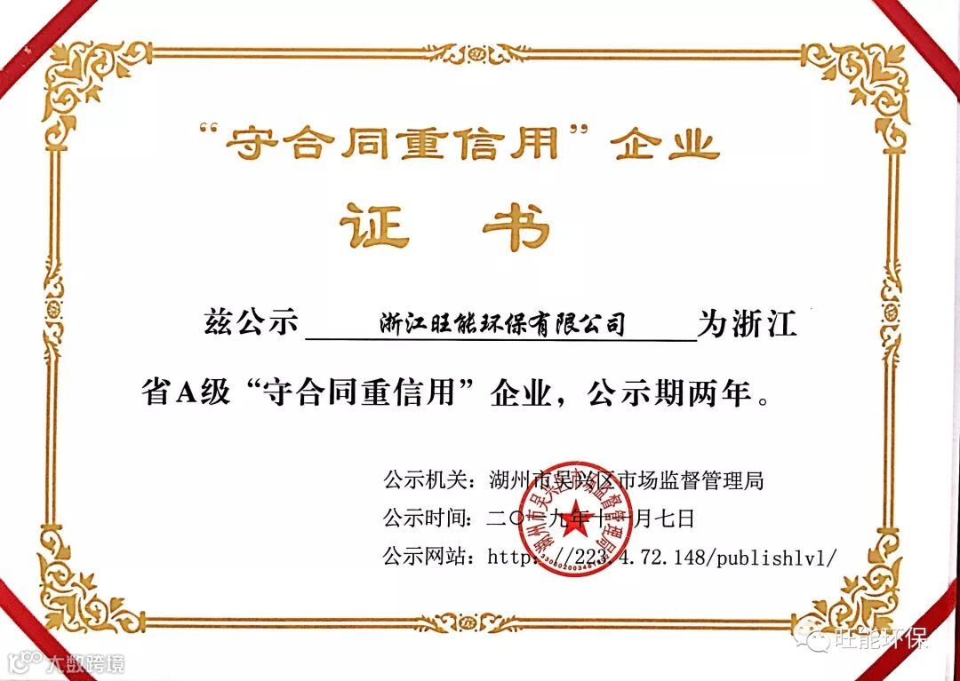 近日,浙江旺能环保有限公司被湖州市吴兴区市场监督管理局评定为2019年浙江省A级“守合同重信用”企业。