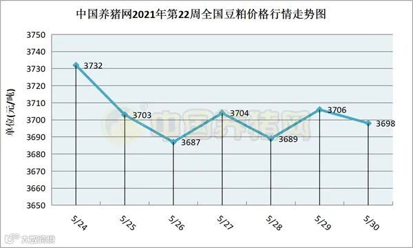 据中国养猪网猪价系统数据监测,2021年第22周(2021年05月24日至2021年05月30日)本周豆粕价格跌涨交替,价格上下波动,整体有所回落。全周豆粕价格区间在3687-3732元/吨之间,周初豆粕价格为3732元/吨,周末价格为3698元/吨,全周豆粕价格累计下跌了12元/吨。
