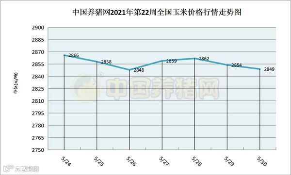 据中国养猪网猪价系统数据监测,2021年第22周(2021年05月24日至2021年05月30日)本周我国玉米价格主要处于平稳态势,行情略有下跌。全周玉米价格区间在2848-2866元/吨,周初玉米价格为2866元/吨,周末价格为2849元/吨,全周玉米价格累计下跌了17元/吨。