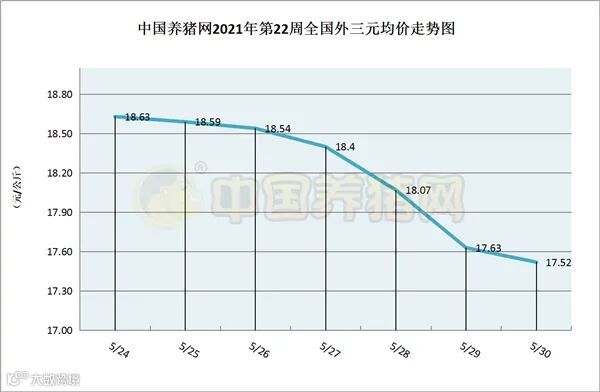 据中国养猪网猪价系统数据监测,2021年第22周(2021年05月24日至2021年05月30日)国内外三元生猪价格呈现下跌走势,周前区域平稳,周中和周末跌幅较大。本周猪价区间在17.52-18.63元/公斤之间!周初猪价为18.63元/公斤,周末猪价为17.52元/公斤,全周猪价累计下跌了1.11元/公斤。