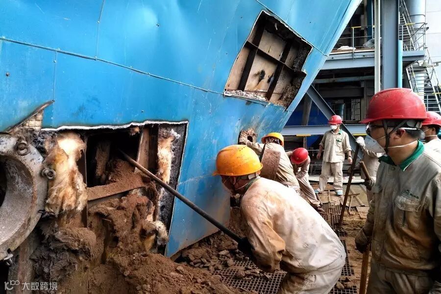当检修人员开启急冷塔人孔门进行检查时,发现尾气急冷塔积灰已经非常严重,几乎整个仓室都堆满了积存的灰尘,最高的有几处一直堆到了急冷塔圆筒底部,有将近10几米的高度,而积灰由于潮湿并不是呈松散状,更夸张的是有些积灰因高温灼烧已经呈现成类似于大理石板状,硬度也与水泥板不相上下。在兰溪旺能生产部和检修人员商量好方案后,大家取来了铁锹,耙子、铁棍、风镐等工具就马上热火朝天地干了起来。因为料仓底部比较狭窄,积灰堵得比较严实,这无疑增加了清理难度。检修人员又在仓底割开了一两个口子用来疏通积灰。大家分组进行,两人或三人一组不等守在人孔门等处。先用铁棍疏通搭桥的积灰,再用耙子扒到仓外,而硬的灰板则必须用风镐打,有时积灰太硬还只能用风镐一点一点的抠,而堆在场地上的灰则用铁锹锹到指定位置。由于已是初夏,天气闷热,一会儿大家就已经汗流浃背,虽然戴着口罩但扬起的灰尘还是会往口鼻里钻,但是没有一个人抱怨。大家就这样静默不语,有条不紊地进行着工作。清灰工作一直在持续,即使是吃饭也是大家轮流进行。一些人手里起了泡,由于长时间弯腰,胳膊、腿以及背部都是又酸又痛但大家一直坚持着……经过近12小时的努力,大家终于完成了这项艰巨的任务。而大家的衣服上,帽子上包括口罩上都已经全是灰尘。锅炉重新扬火带负荷,大家的努力得到了回报。