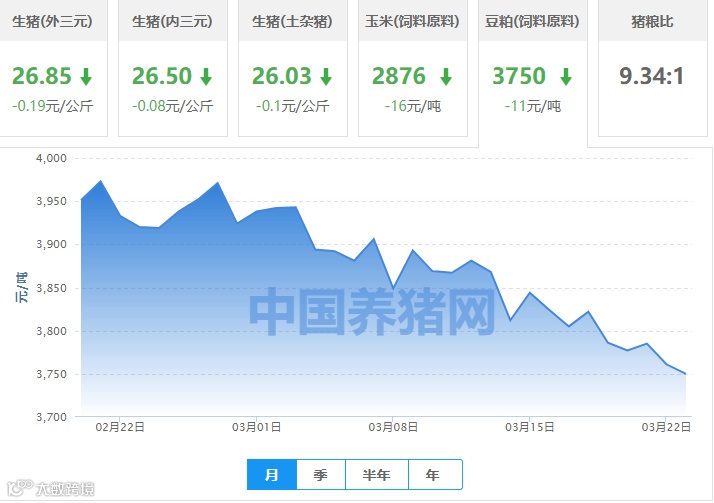 | 地区名称 | 外三元(元/公斤) | 内三元(元/公斤) | 土杂猪(元/公斤) | 玉米(元/吨) | 豆粕(元/吨) |