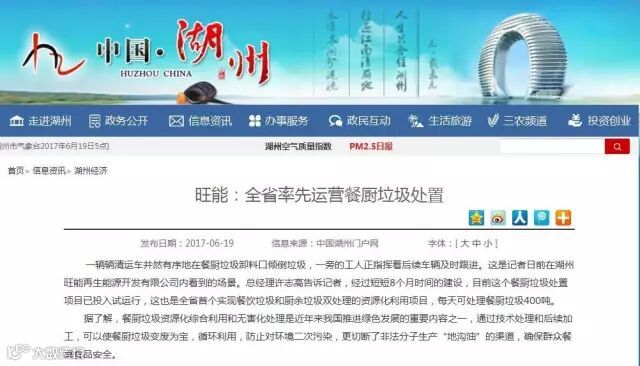 ▲湖州市政府门户网站报道