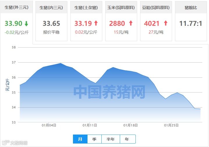 | 地区名称 | 外三元(元/公斤) | 内三元(元/公斤) | 土杂猪(元/公斤) | 玉米(元/吨) | 豆粕(元/吨) |