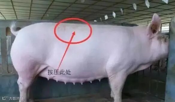 用拇指与食指用力压捏母猪第9胸椎到第12胸椎背中线处,如背中部指压处母猪表现凹陷反应,即表示未受孕;如指压时表现不凹陷反应,甚至稍凸起或不动,则为妊娠。