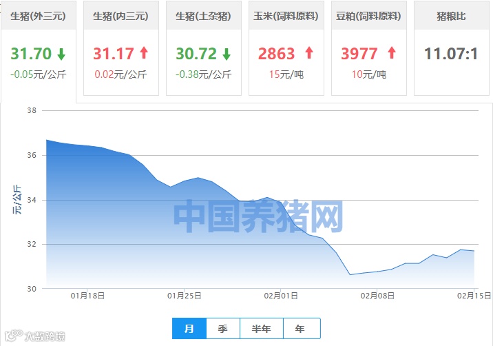 | 地区名称 | 外三元(元/公斤) | 内三元(元/公斤) | 土杂猪(元/公斤) | 玉米(元/吨) | 豆粕(元/吨) |