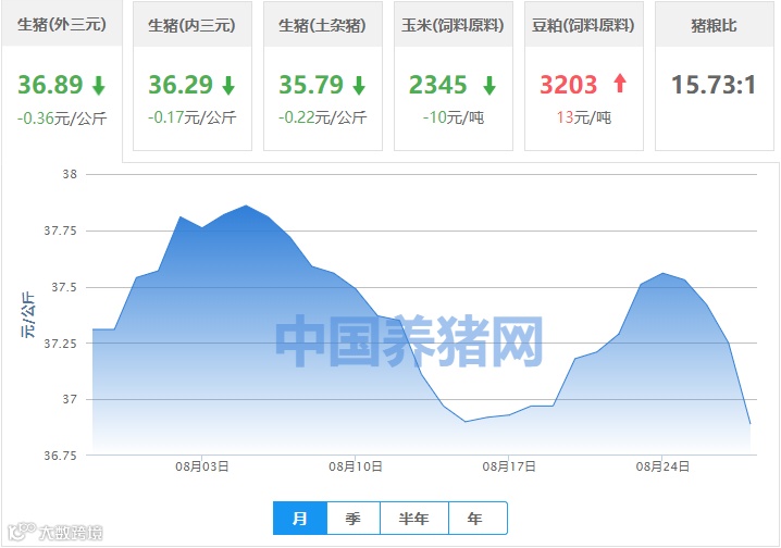 | 地区名称 | 外三元(元/公斤) | 内三元(元/公斤) | 土杂猪(元/公斤) | 玉米(元/吨) | 豆粕(元/吨) |