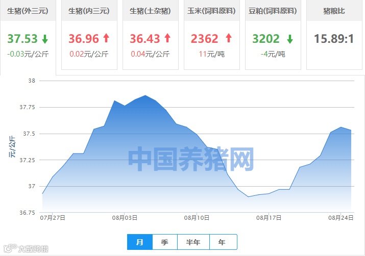 | 地区名称 | 外三元(元/公斤) | 内三元(元/公斤) | 土杂猪(元/公斤) | 玉米(元/吨) | 豆粕(元/吨) |