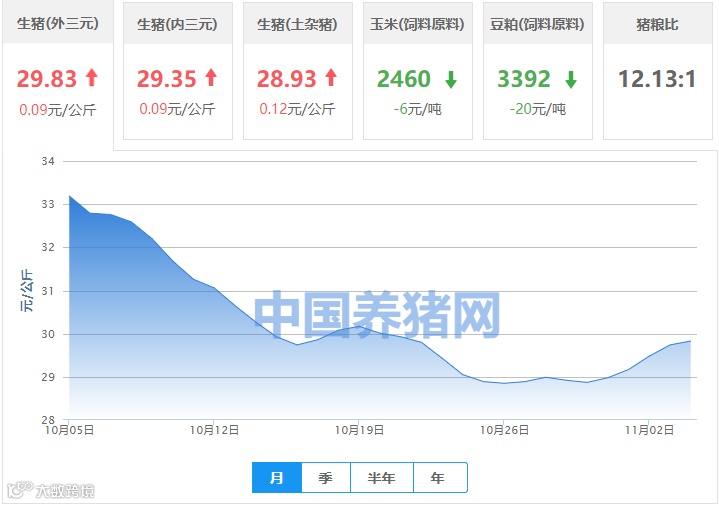 | 地区名称 | 外三元(元/公斤) | 内三元(元/公斤) | 土杂猪(元/公斤) | 玉米(元/吨) | 豆粕(元/吨) |