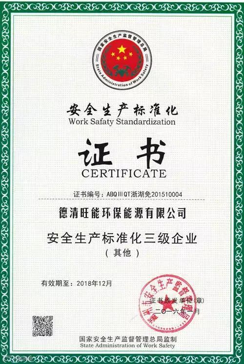 2016年3月11日,德清旺能通过并取得安全生产标准化免审证书。