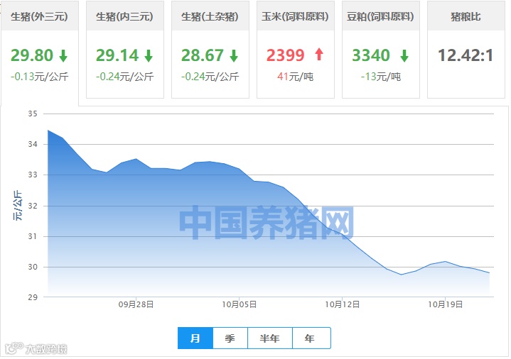 | 地区名称 | 外三元(元/公斤) | 内三元(元/公斤) | 土杂猪(元/公斤) | 玉米(元/吨) | 豆粕(元/吨) |